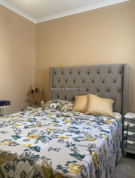 Habitación 1 (Doble): La habitación principal es amplia, con un gran cabecero capitoné, mesitas de noche de espejo y ventana al exterior.